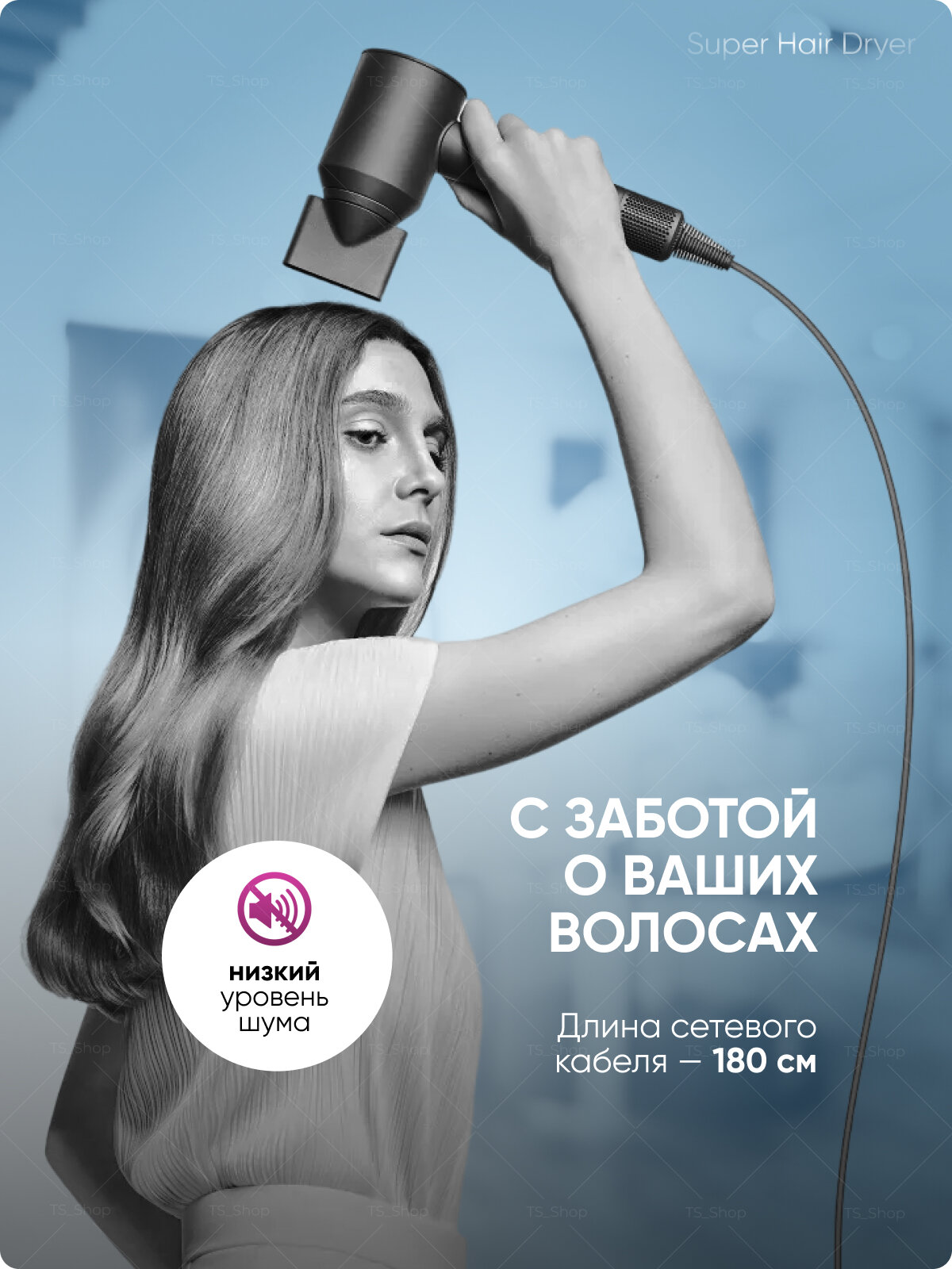 | Плюсы: | Отлично сушит волосы, несмотря на небольшой размер большой поток воздуха. Очень удобные насадки. Длинный шнур. |