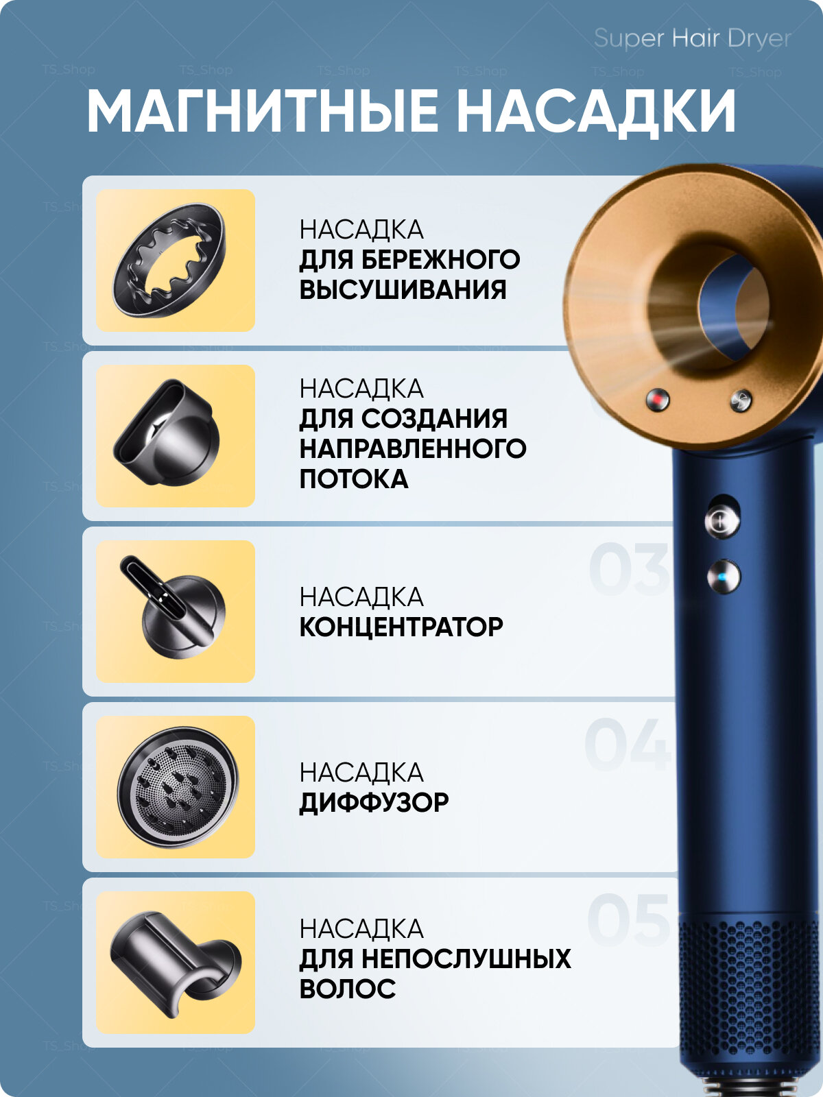 Фен профессиональный/ Самый мощный скорости/ 3 температурных режима / 5 магнитных насадок/Золотой Гарантия качества