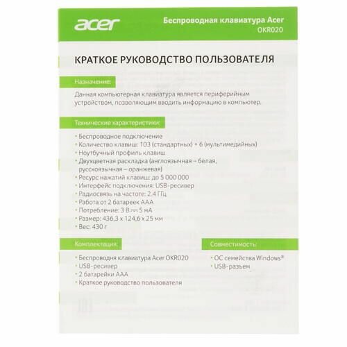 Купить Клавиатура Acer Беспроводная, OKR020, черная (ZL.KBDEE.004)
