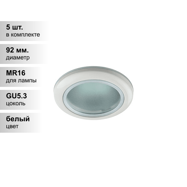 Сохранить(5 шт.) Влагозащищенный встраиваемый светильник ЭРА WR1 WH, для ламп с цоколем GU5.3, тип ламп MR16, макс. 50 Вт, напряжение 12 В, белый, матовое влагозащищенное стекло, размер 92x33мм, врезное отверстие 70мм интересное: