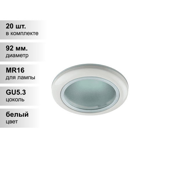 Сохранить(20 шт.) Влагозащищенный встраиваемый светильник ЭРА WR1 WH, для ламп с цоколем GU5.3, тип ламп MR16, макс. 50 Вт, напряжение 12 В, белый, матовое влагозащищенное стекло, размер 92x33мм, врезное отверстие 70мм интересное: