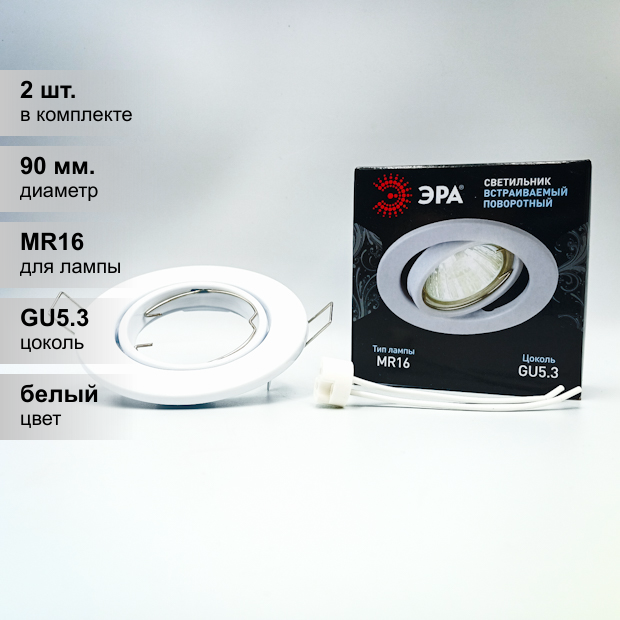 Купить (2 шт.) Светильник точечный поворотный ЭРА ST2A WH, тип лампы MR16, цоколь GU5.3, напряжение 12 В, макс. мощность лампы 50 Вт, штамп. сталь, белый, размер 90x28 мм, диаметр врезного отверстия 70 мм