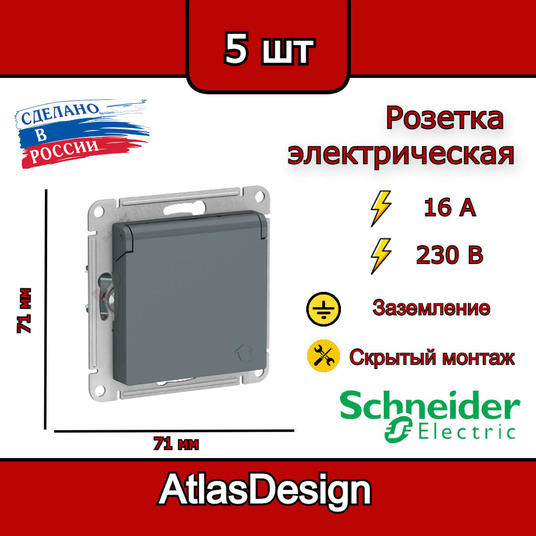 Купить Розетка с заземлением, со шторками, с крышкой, 16А, IP20, грифель Schneider Electric AtlasDesign (комплект 5шт)