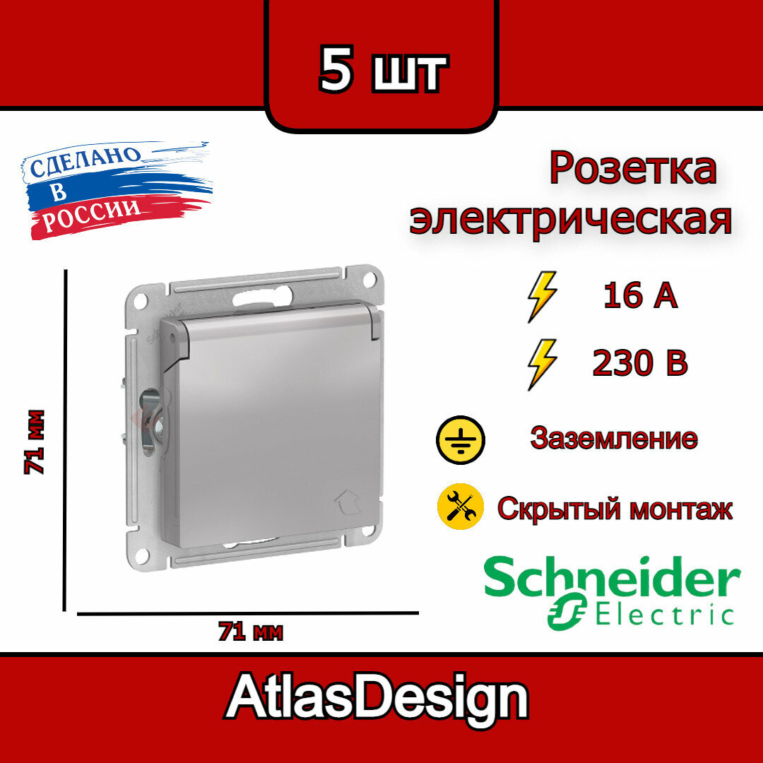 Купить Розетка с заземлением, со шторками, с крышкой, 16А, IP20, алюминий Schneider Electric AtlasDesign (комплект 5шт)