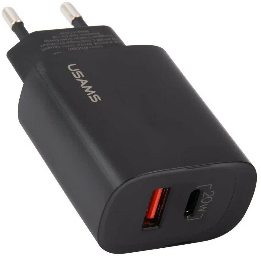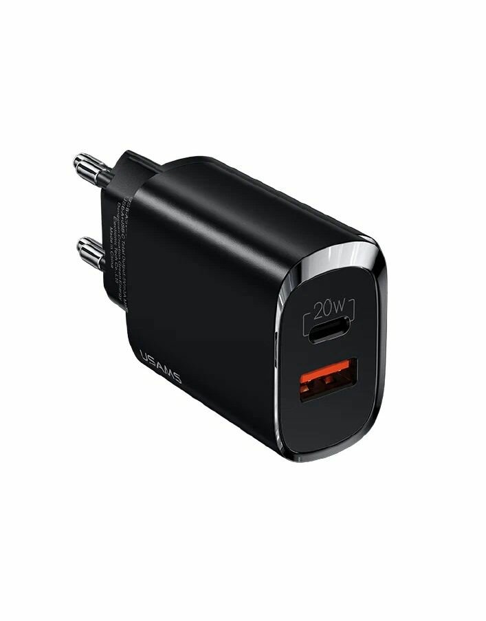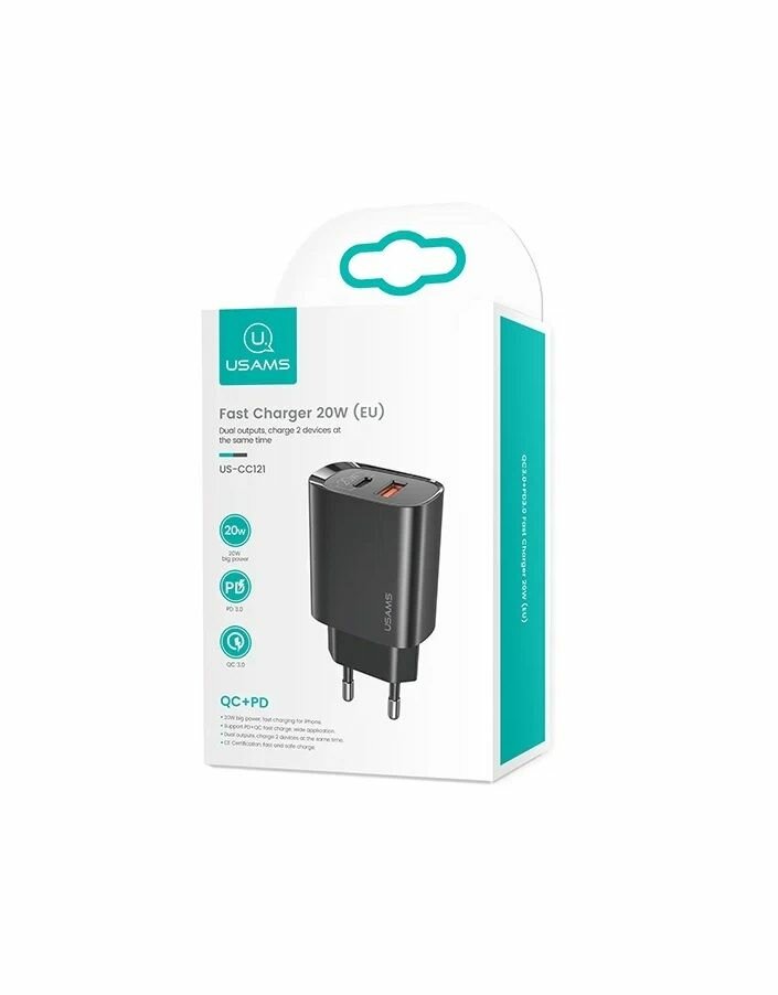 Сетевое зарядное устройство Usams CC121 с функцией одновременной быстрой зарядкой двух устройств Fast Charger QC 3.0 + PD 3.0, 20W, адаптер для iPhone 12 с Type C и USB портами. Цвет - чёрный