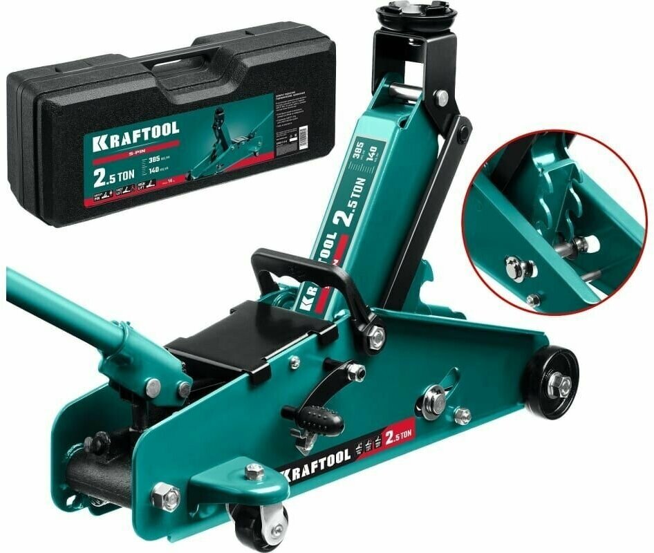 KRAFTOOL S-PIN, в кейсе 2.5 т, 140 - 385 мм, с увеличенным подъемом и фиксатором, подкатной домкрат (43457-2.5-K)
