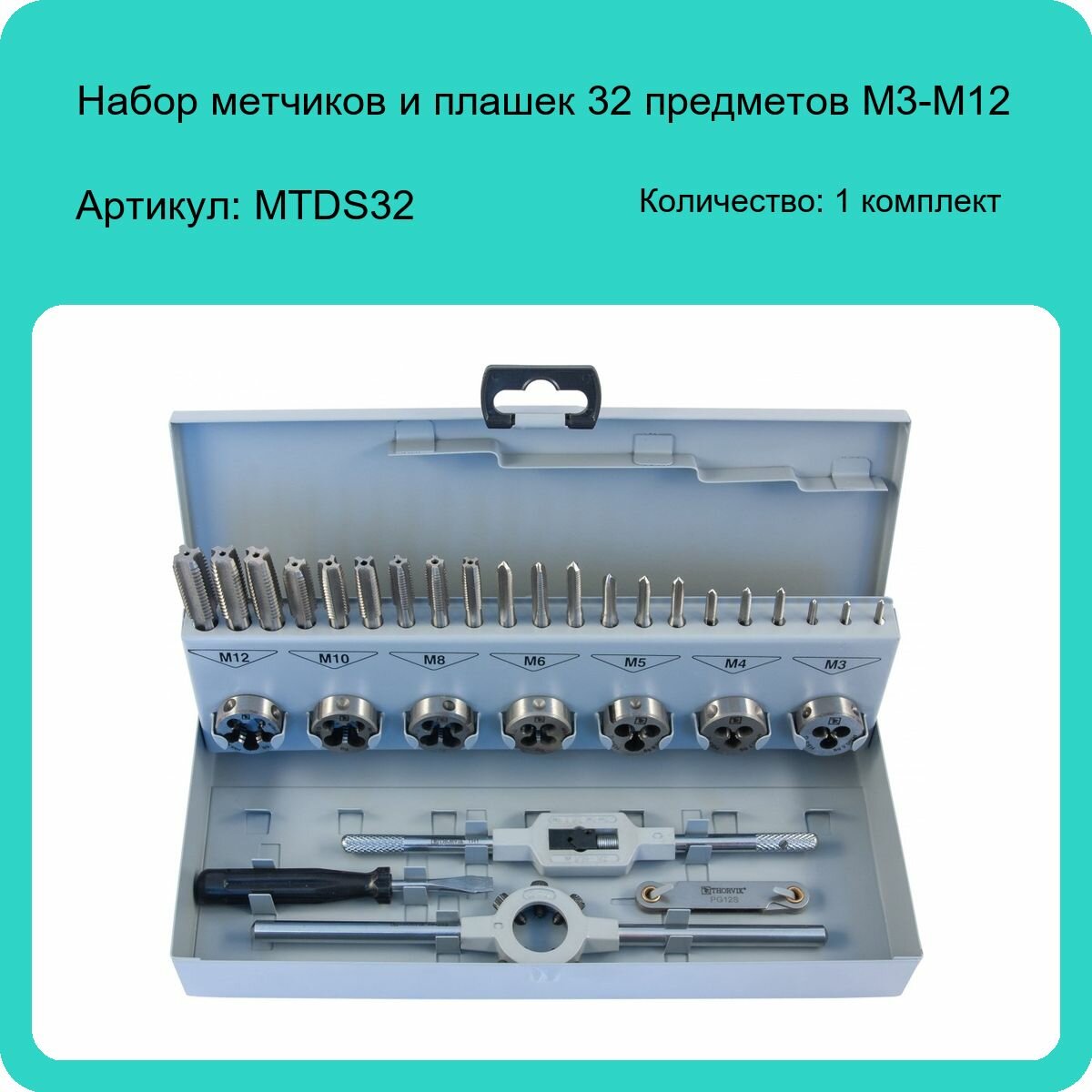 THORVIK MTDS32 Набор метчиков и пашек 32 пр: М3 - М12 с держатеями, вороток, резьбомер