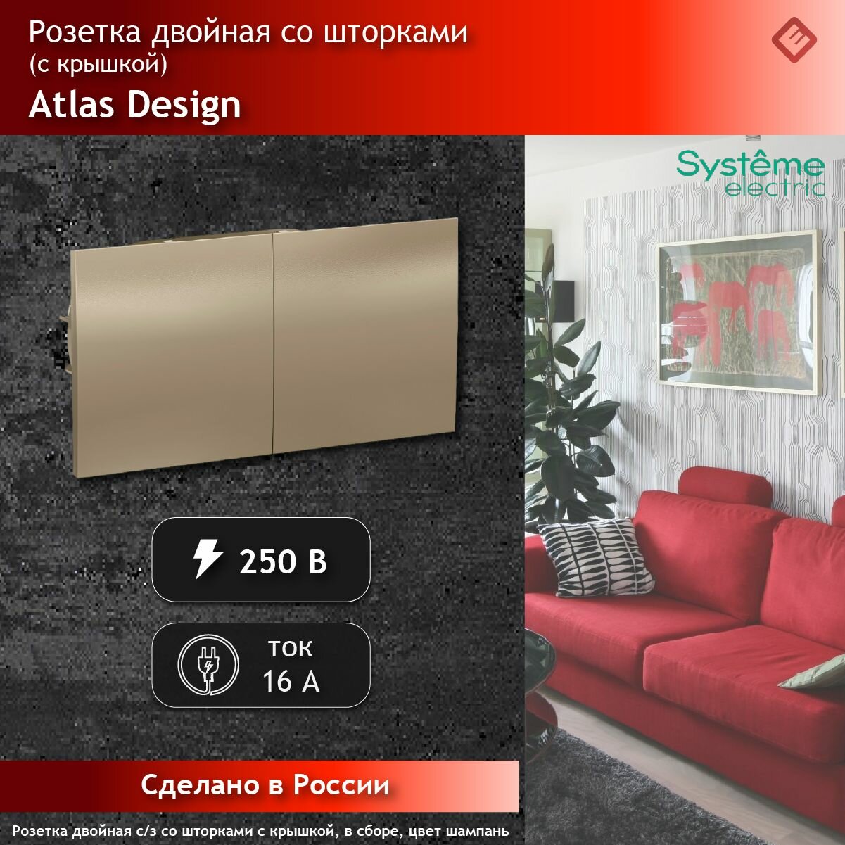 SE AtlasDesign Шампань Розетка с/з двойная, со шторками, с крышкой, 16А, в сборе