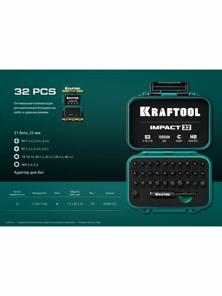 Набор бит ударных Impact 32, KRAFTOOL 26066-H32, Cr-Mo-V-Nb, высокоточ. шлицы, ударопр. суп 26066-H32
