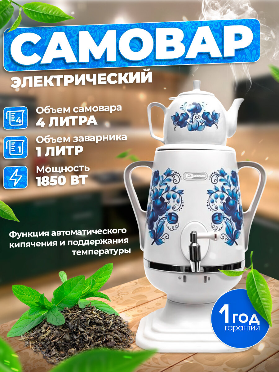 Cамовар электрический Термопот Добрыня DO-421 белый ГЖЕЛЬ на 4 литра/ с заварочным чайником на 1 литр (OL)