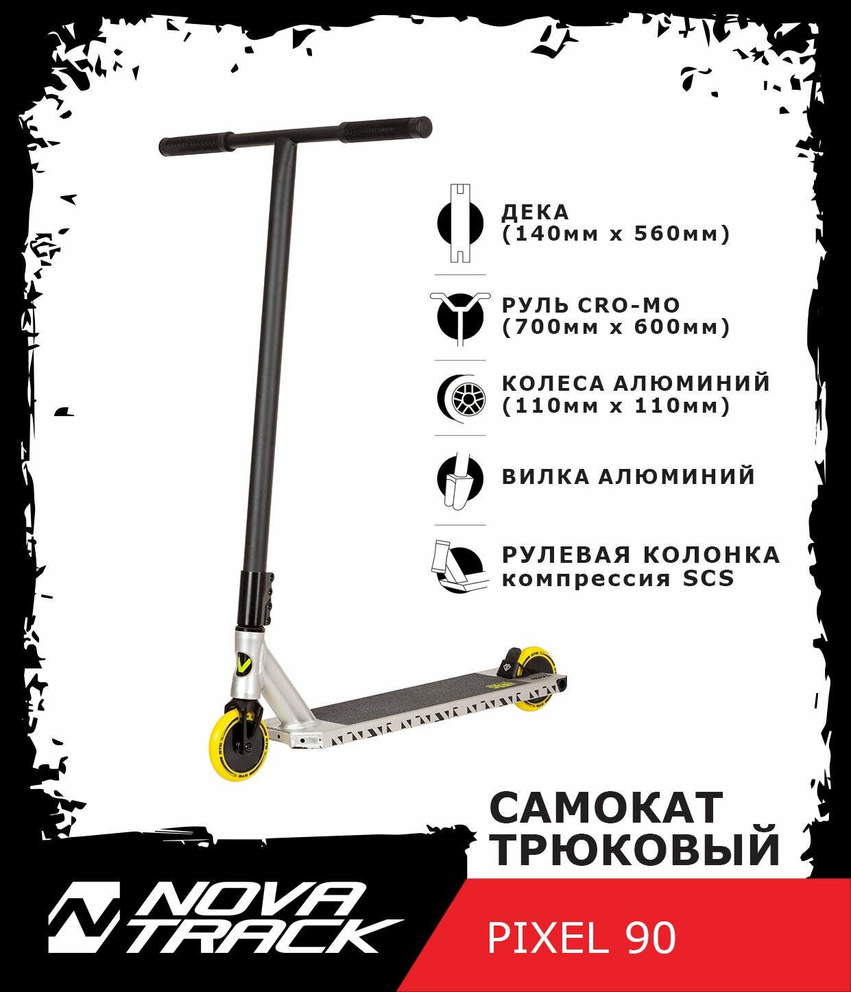 Самокат трюковый NOVATRACK PIXEL'90, PU колеса 110 мм с алюмин.ободом, жесткость PU 88A, серебристый интересное: