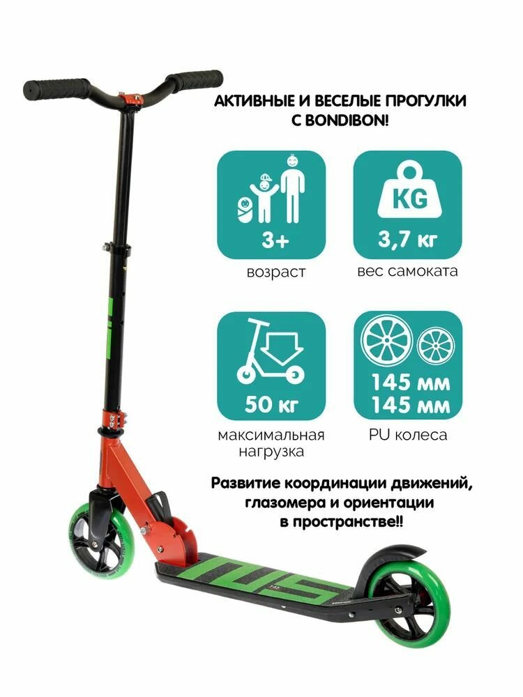 Самокат детский BONDIBON NIMBUS сталь+пластик, складной, колеса PU 145145мм, зеленый