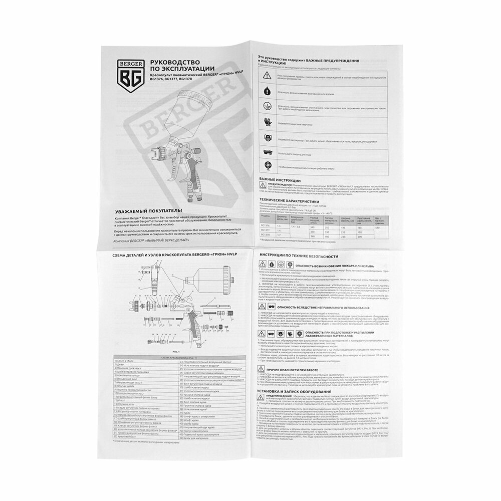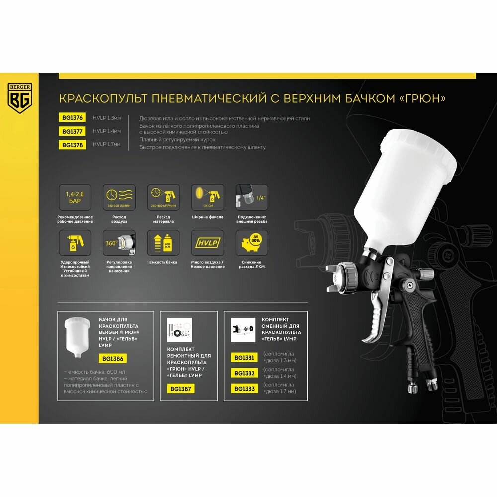 Краскопульт пневматический BERGER "грюн" HVLP 1.4 мм BG1377 интересное: