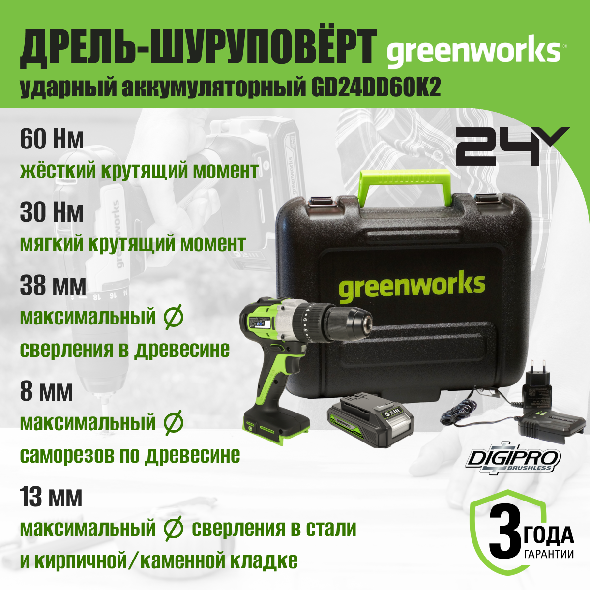 Дрель-шуруповерт аккумуляторная Greenworks GD24DD60K2, 24V, c 1хАКБ 2 Ач и ЗУ в кейсе