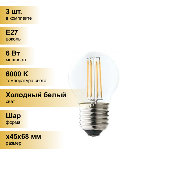 Купить (3 шт.) Светодиодная лампочка Ecola шар G45 E27 6W 6000K 6K прозр. 68x45 филамент (нитевидная), 360° Premium N7PD60ELC Холодный белый. Цоколь E27