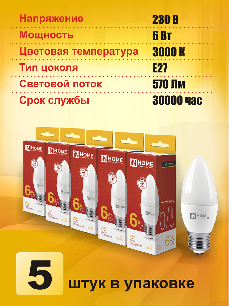 Лампа светодиодная IN HOME LED-СВЕЧА-VC 6Вт Е27 3000К 570Лм, Теплый белый свет, 10шт.