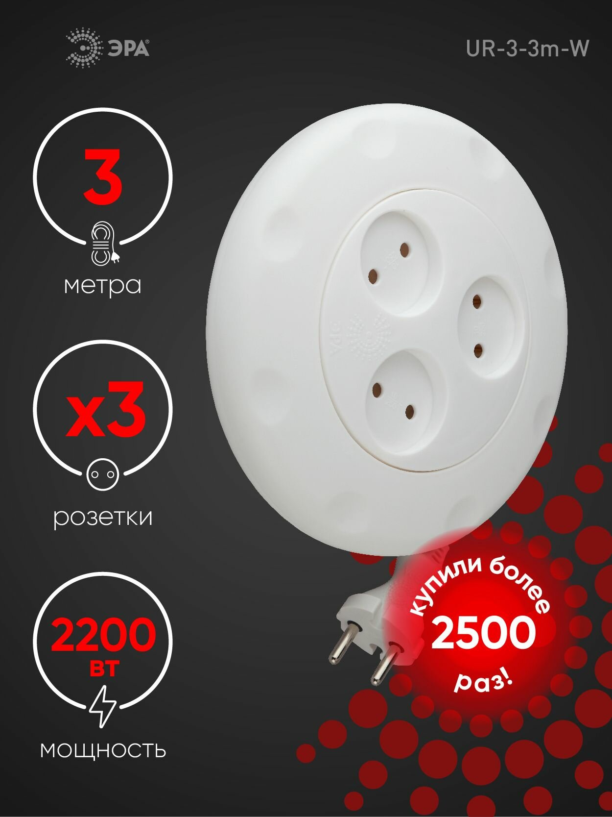 ЭРА Б0019038 !выведено из ассортимента UR-3-3m-W Удленитель-рулетка, без заземл., 3гн, 3м, ШВВП, 2x0.75мм2, 10А