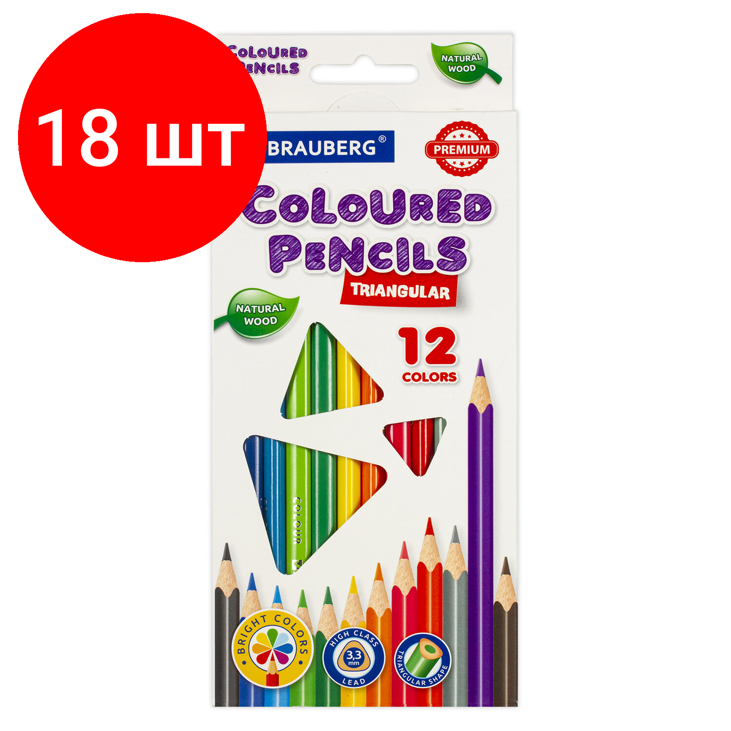 Купить Комплект 18 шт, Карандаши цветные BRAUBERG PREMIUM, 12 цветов, трехгранные, грифель мягкий 3.3 мм, 181651