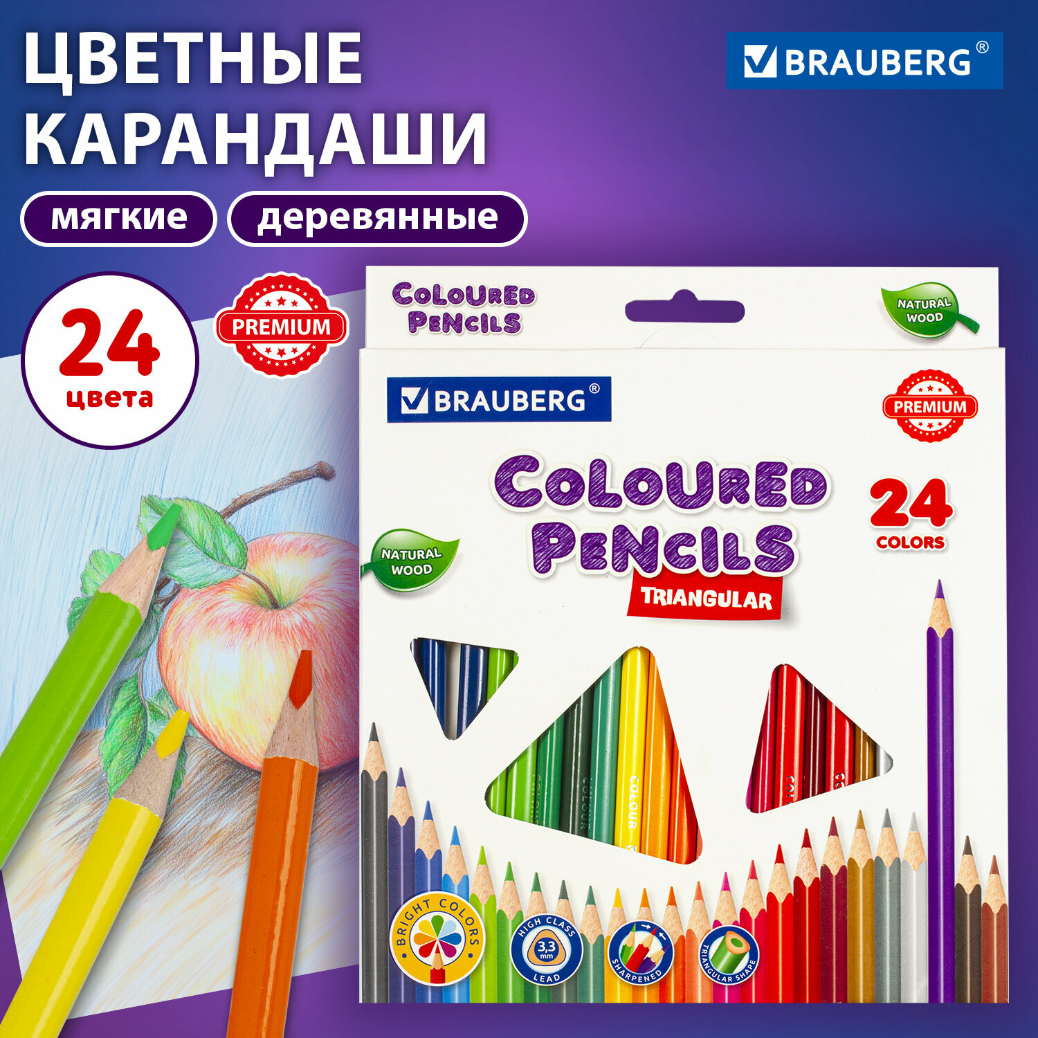 Карандаши деревянные цветные для рисования Brauberg Premium, 24 цвета, трехгранные, грифель мягкий 3,3 мм, 181653