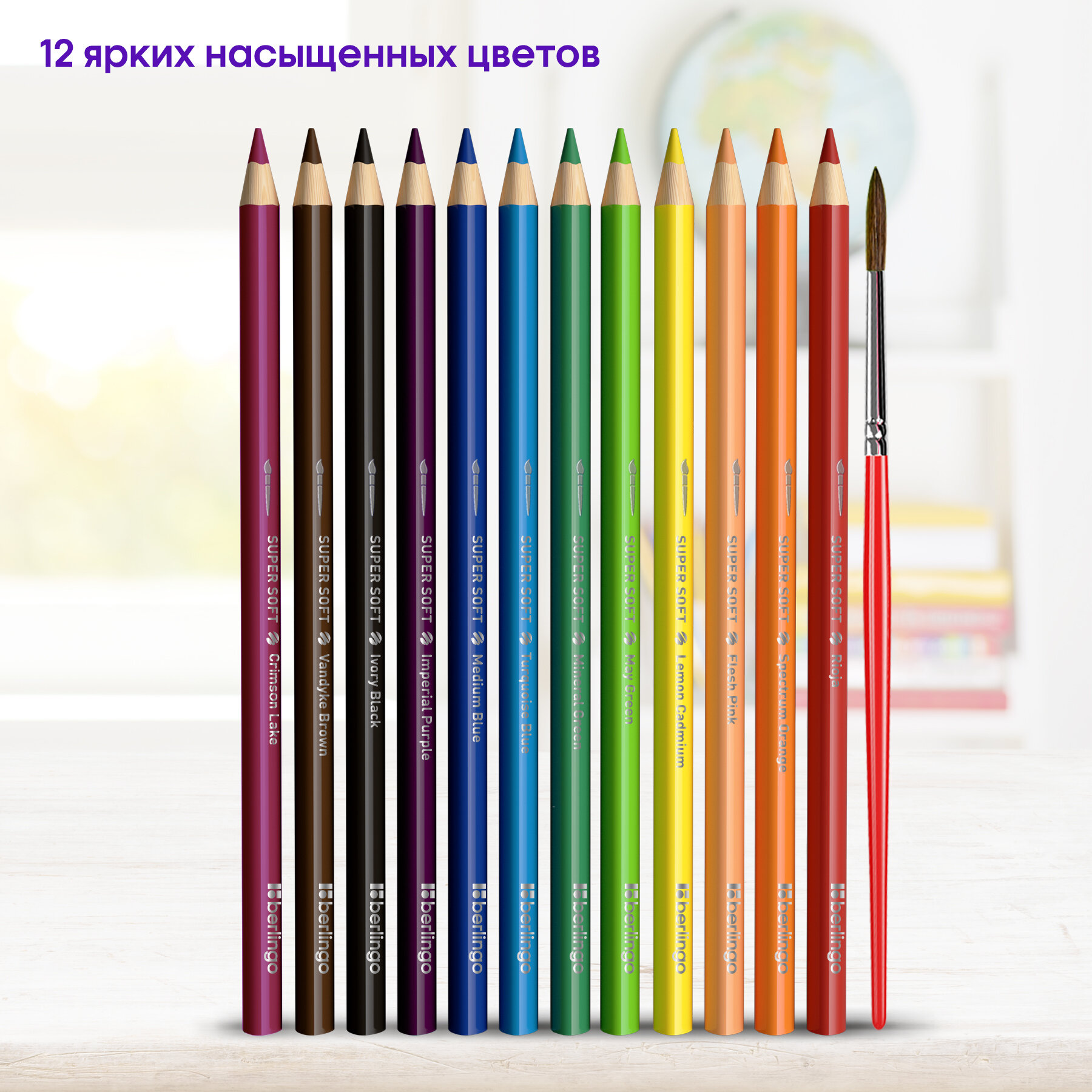 Карандаши акварельные BERLINGO "SuperSoft. Рыбки", 12цв.+кисть, трехгран., заточен., картон, европод