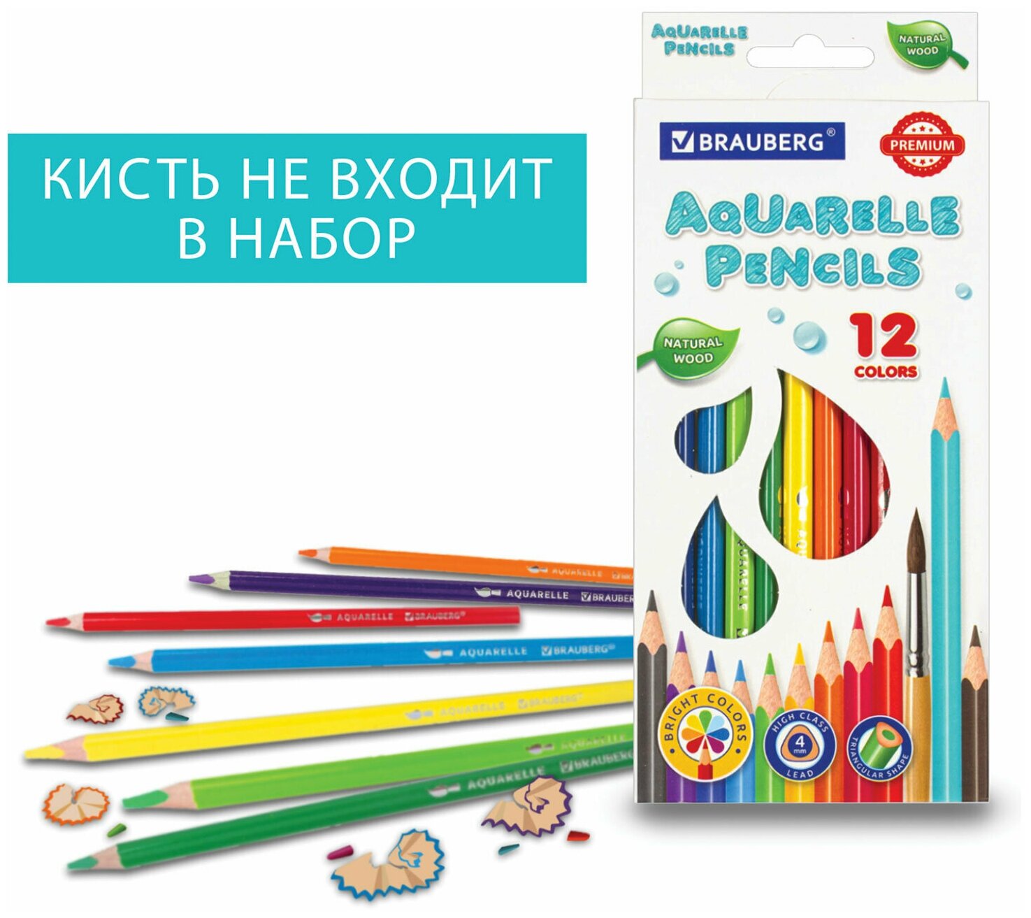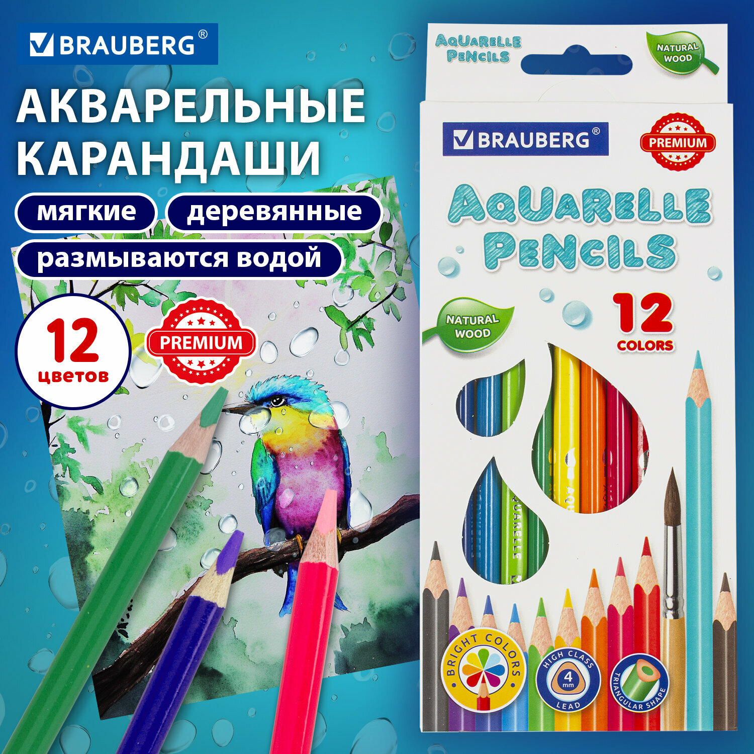 Карандаши цветные Brauberg акварельные, Premium aquarelle, 12 цветов, грифель мягкий, 4 мм (181671), 1 упак.