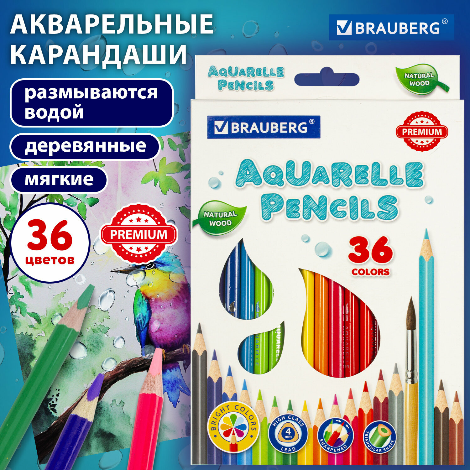 Купить Карандаши цветные акварельные Brauberg Premium Aquarelle, 36 цветов, трехгранные, утолщенный грифель 4 мм, натуральное дерево, 181674