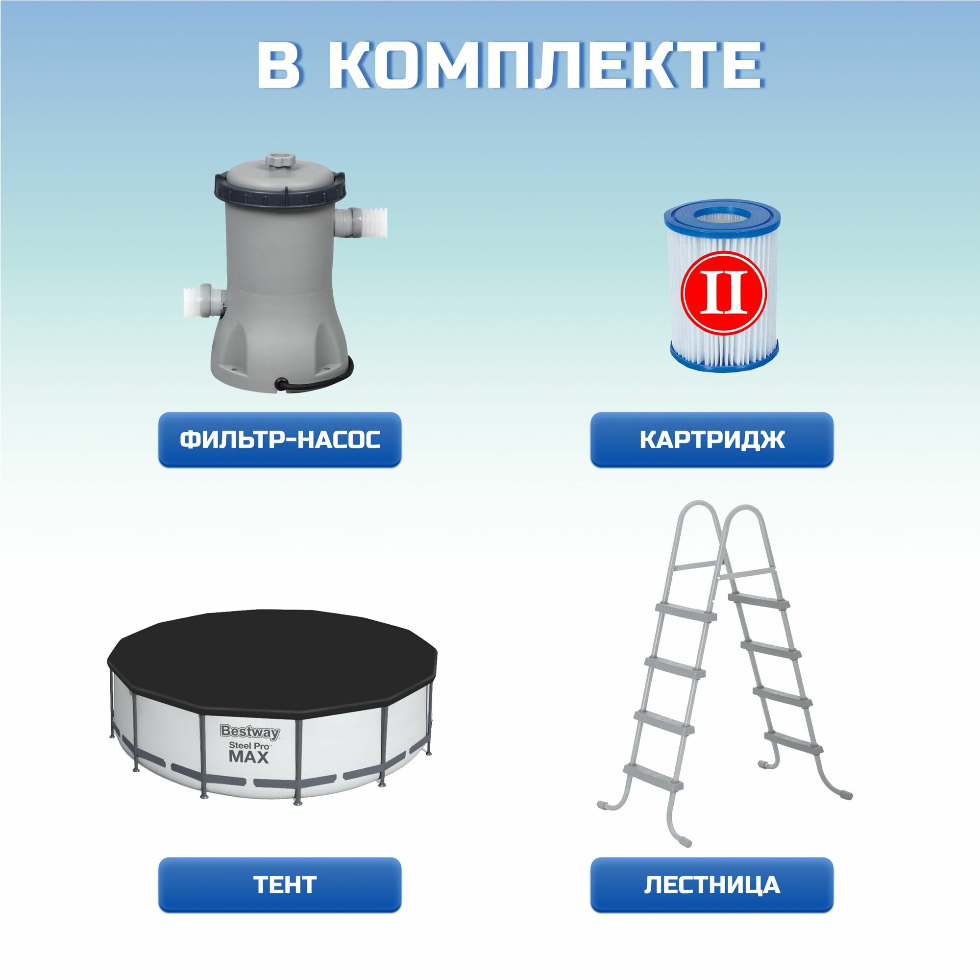 | Дополнительная информация | комплектация: каркас и чаша бассейна, фильтр-насос bestway 58383 220-240v., лестница bestway 58335, чехол bestway 58037, картридж bestway 58094 |