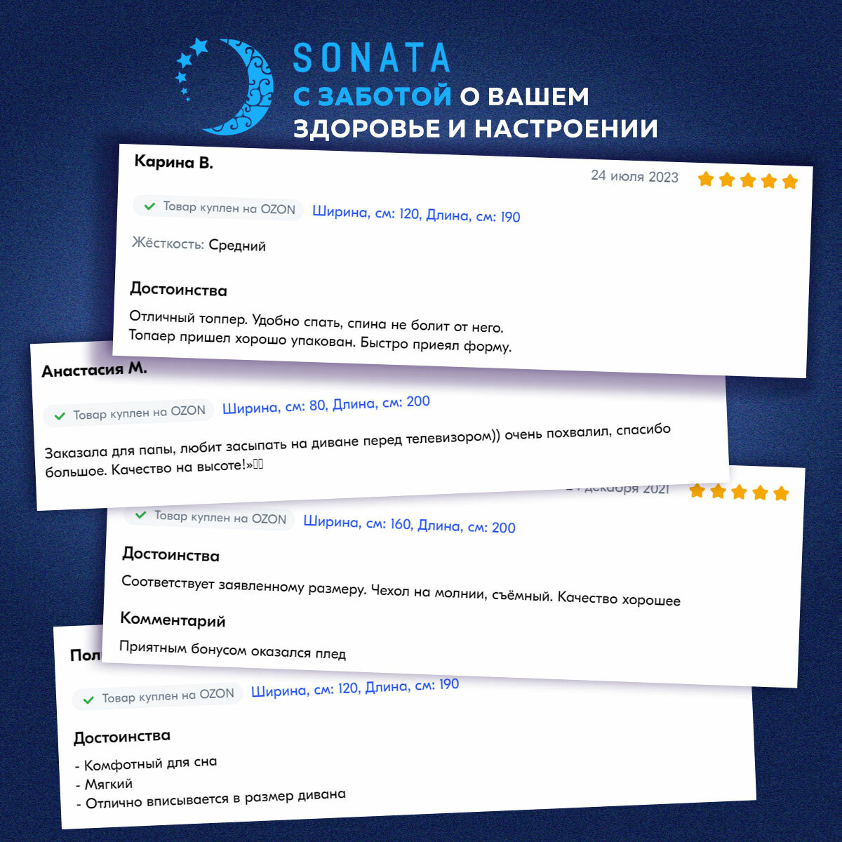 Ниже Вы можете прочитать отзывы на Топпер матрас 80х200 см SONATA, Беспружинный, высота 8 см, Съемный чехол, Плед в подарок, ознакомится с подробными характеристиками, посмотреть интересные обзоры и фотографии на Топпер матрас 80х200 см SONATA, Беспружинный, высота 8 см, Съемный чехол, Плед в подарок.