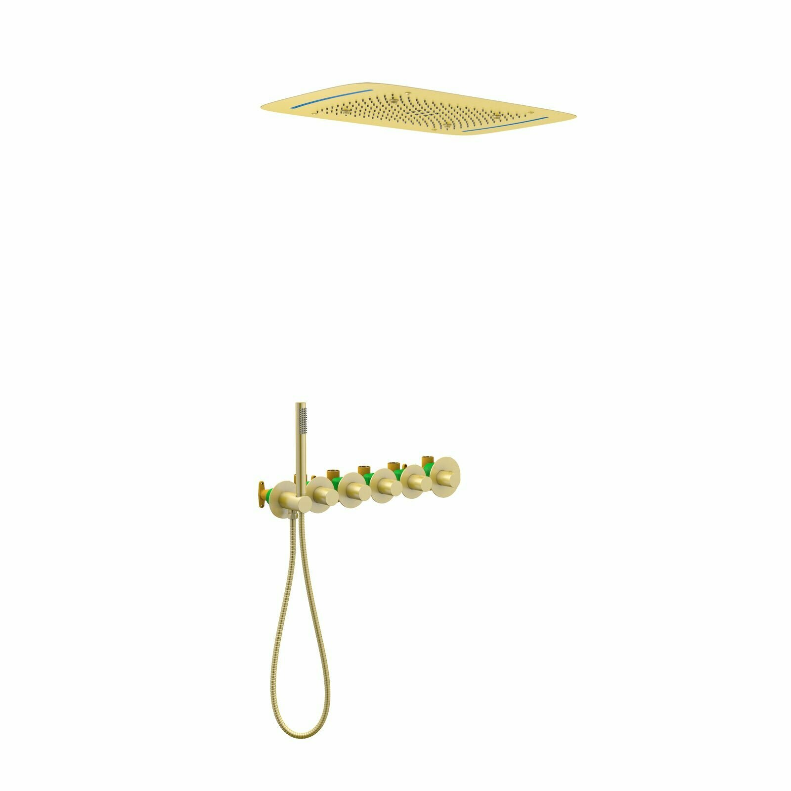 | Дополнительная информация | Встраиваемый блок управления душевой системой (латунный) - 1 шт. Корпус потолочного душа (латунный) - 1 шт. Душевая панель (латунная) 680*430 мм - 1 шт. Винты с гайками для крепления подвесных кронштейнов (комплект) - 4 шт. Держатель ручной лейки с подключением душа (латунный) - 1 шт. Подвесные кронштейны - 2 шт. Подводка к тропическому душу - 3 шт. Ручка дивертора - 4 шт. Ручка управления термостатом - 1 шт. Декоративные накладки с гильзами (комплект) - 6 шт. Ручная лейка (латунная) - 1 шт. Соединительная трубка для подключения ручного душа - 1 шт. Шланг душа 1,5 м - 1 шт. Блок управления подсветкой - 1 шт. Инвертор (преобразователь тока) - 1 шт. Т-образный соединитель проводов - 1 шт. Скрытый провод - 1 шт. Провод блока управления подсветкой - 1 шт. Инструкция - 1 шт. |