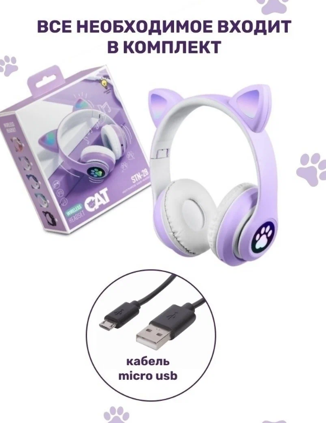 Наушники беспроводные светящиеся с ушками STN-28, фиолетовые