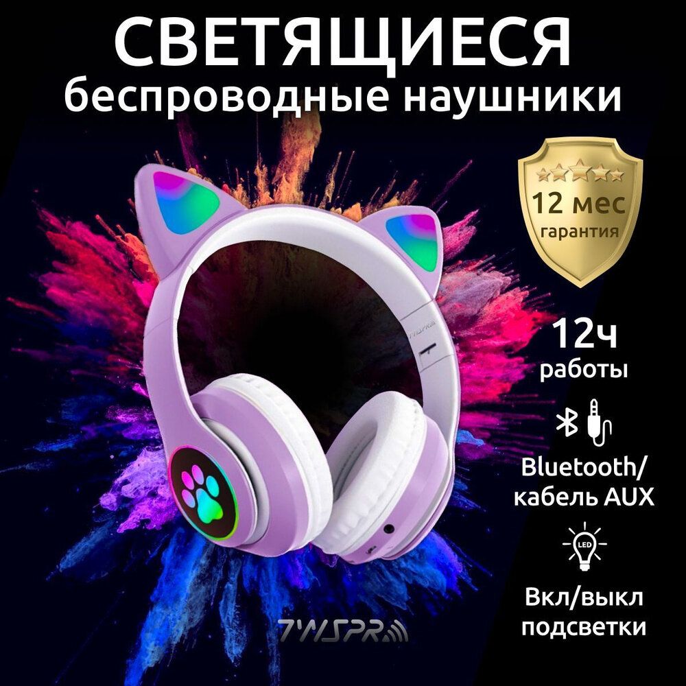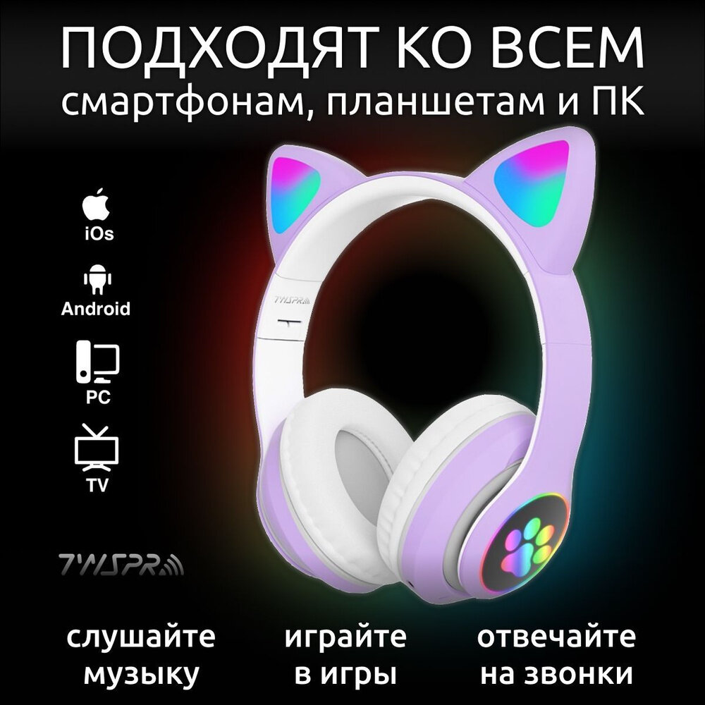 Купить Светящиеся детские беспроводные наушники с ушками / Беспроводные наушники детские / Наушники с ушами / Сиреневый