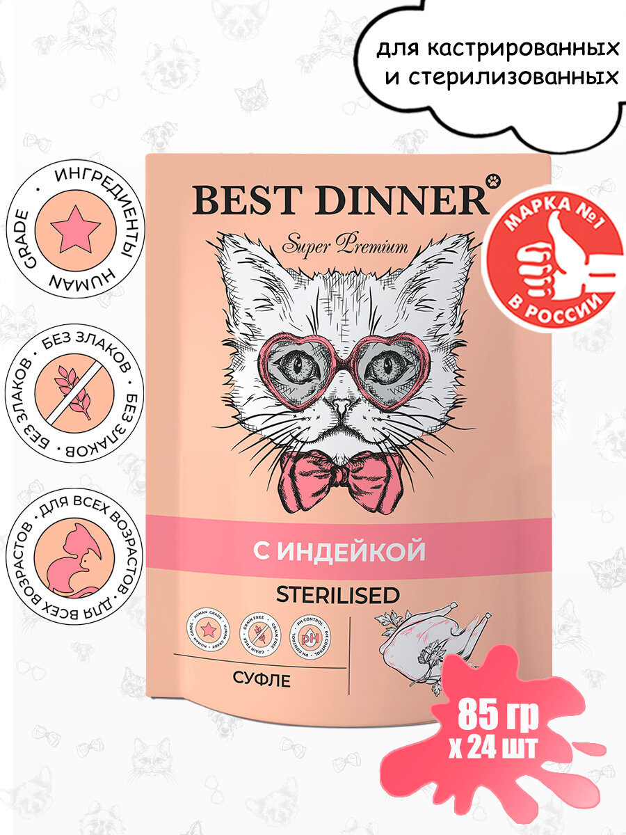 Влажный корм для кошек Best Dinner Бест Диннер Паучи Мясные деликатесы Sterilised /Суфле С Индейкой/ 85 г х 24 шт.