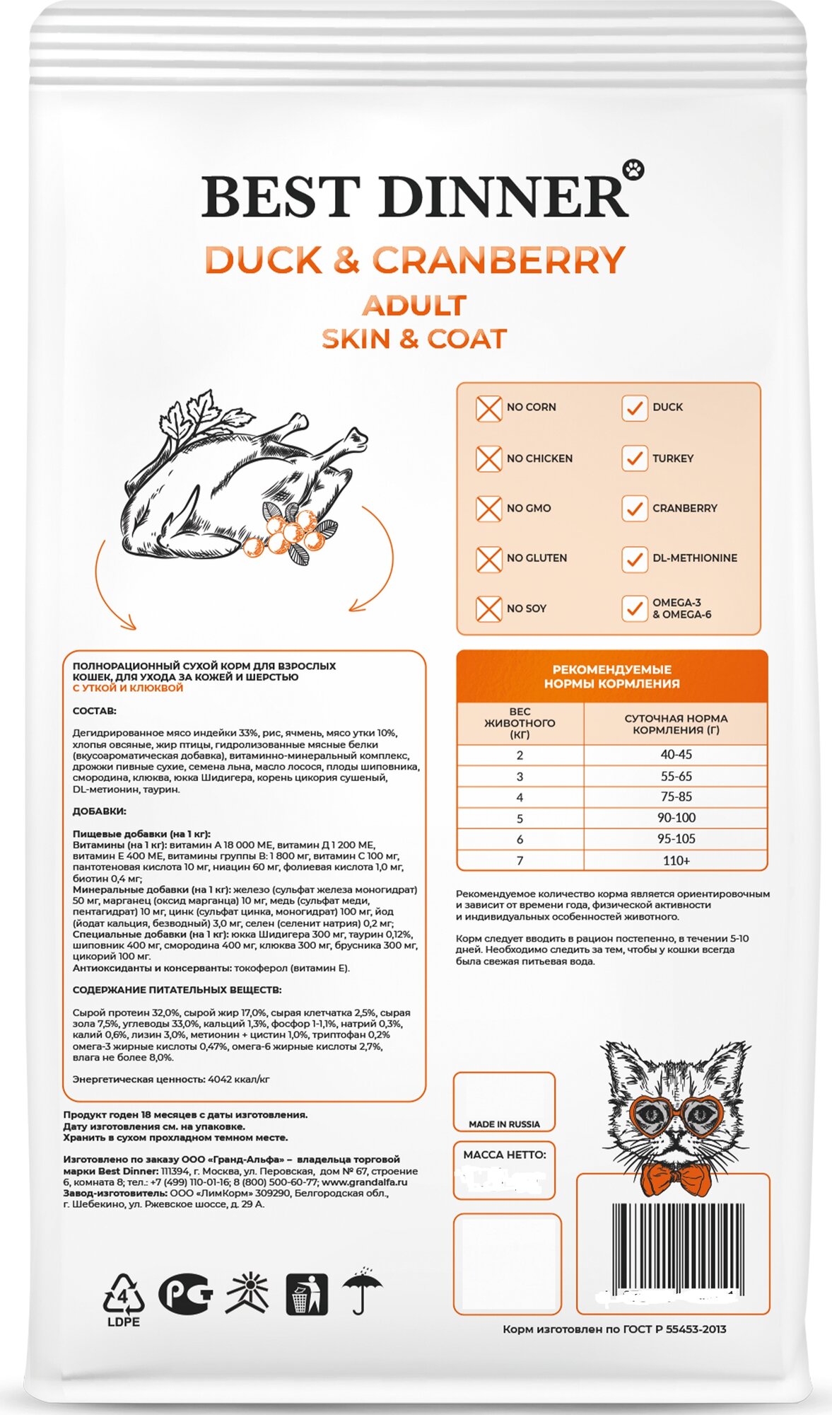 СохранитьСухой корм Best Dinner для кошек Duck & Cranberry с уткой и клюквой для здоровья кожи и шерсти 3 кг интересное: