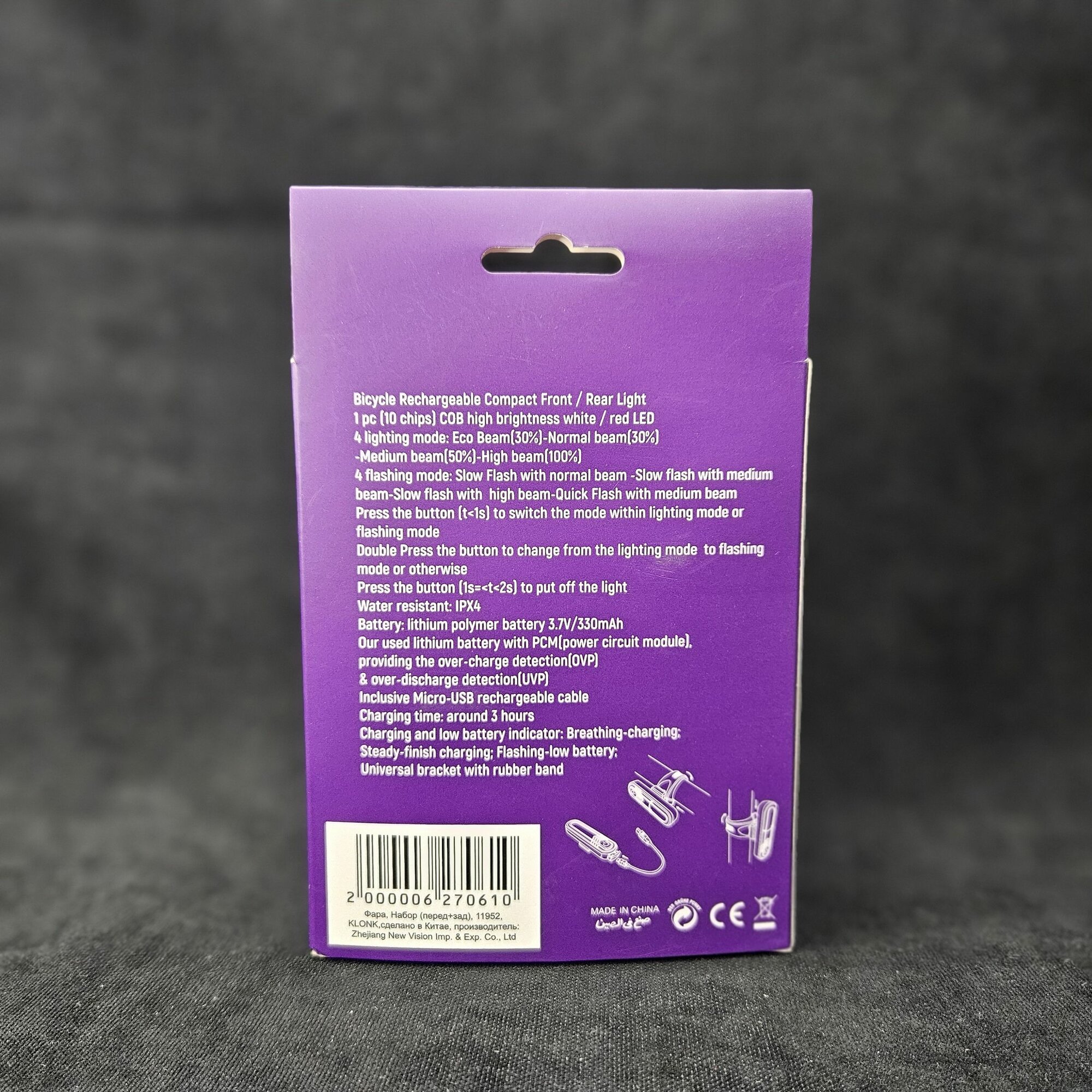 Фонари для велосипеда Klonk 11952 (комплект: LED передн.+задн.), IPX4, micro USB, LiPo 3,7 V/ 330 mAh
