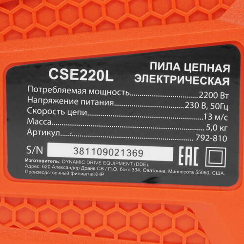 DDE Пила цепная электрическая 792-810 Cse220l 16" 2,2 кВт 40 см 3/8PM-57-1,3 792-810 .