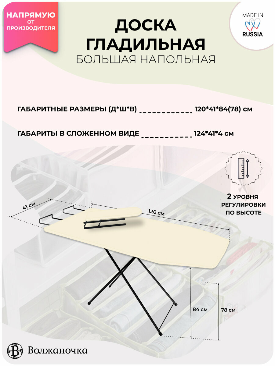 Волжаночка Гладильная доска напольная большая с подрукавником, подставкой для утюга, размер 120х41 см., цвет бежевый