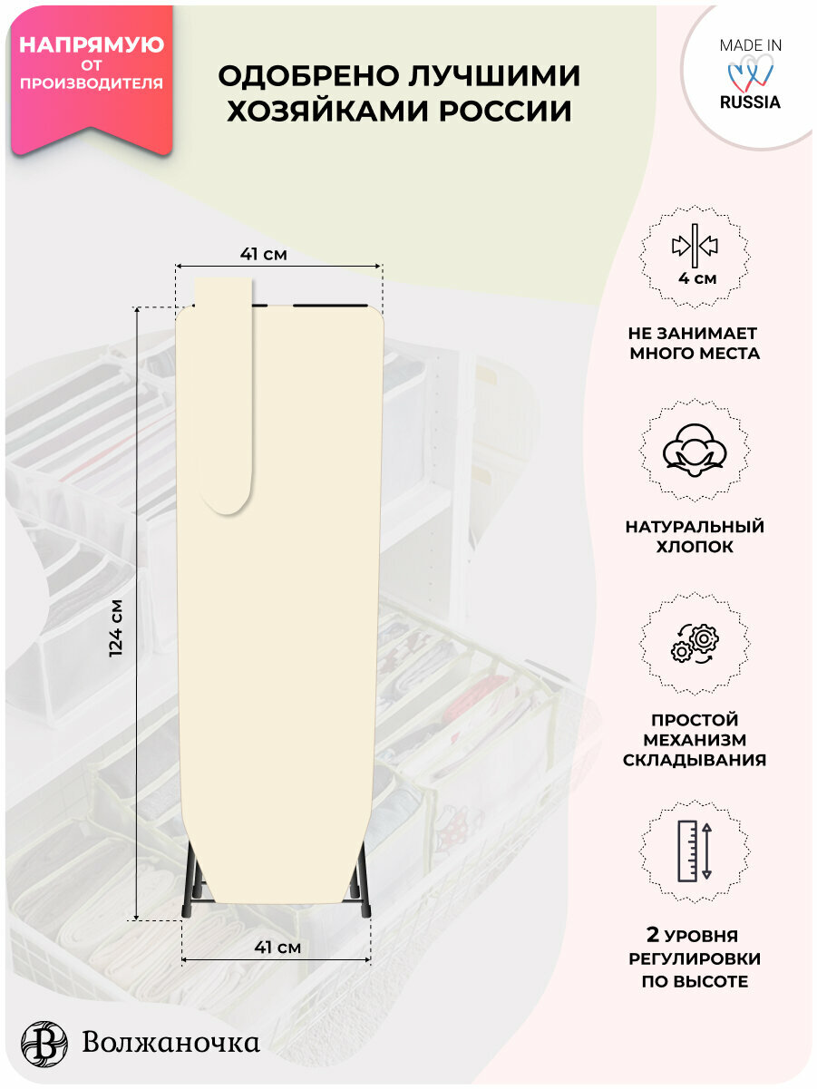 СохранитьВолжаночка Гладильная доска напольная большая с подрукавником, подставкой для утюга, размер 120х41 см., цвет светло-бежевый интересное: