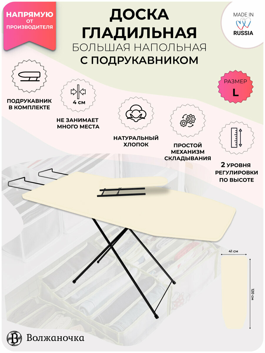 Волжаночка Гладильная доска напольная большая с подрукавником, подставкой для утюга, размер 120х41 см., цвет слоновая кость