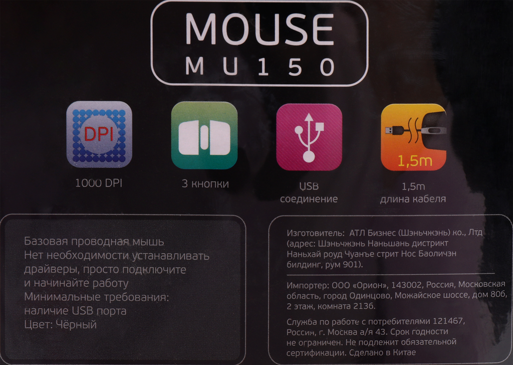Мышь компьютерная игровая проводная MU190 Intro полноразмерная черная, 1200DPI