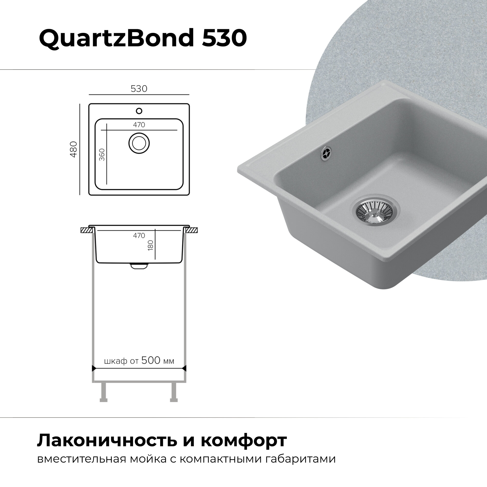 Кварцевая мойка для кухни QUARTZBOND BOND-480, дым, 480 х 180