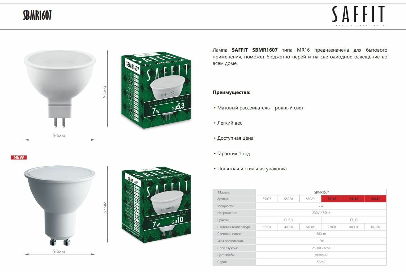 Saffit MR16 GU10 230V 7W(560Lm) 4000K 4K 57x50 SBMR1607 55146 (арт. 783587)
