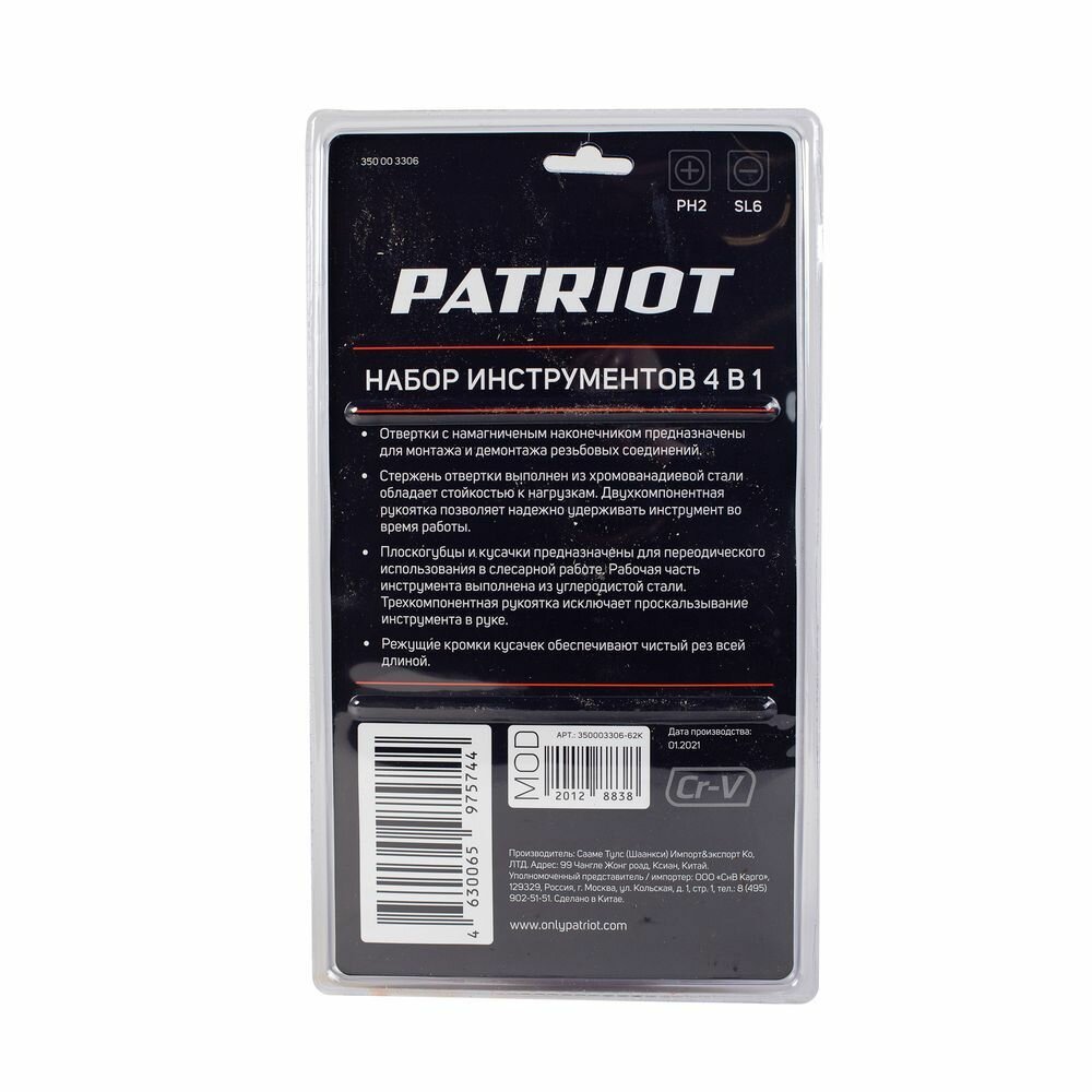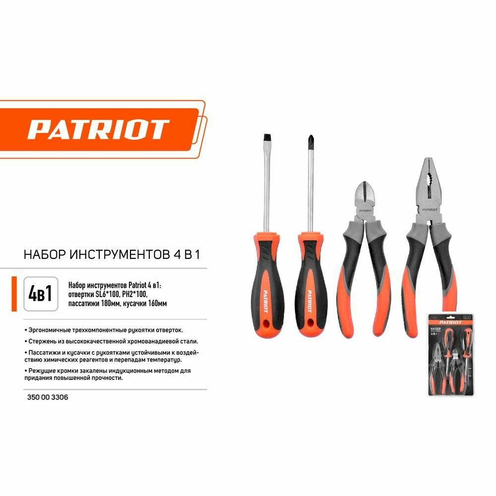 Набор инструментов Patriot 4 в 1 SPS-4: отвертки SL6*100, PH2*100, пассатижи 180мм, кусачки 160мм 350003306
