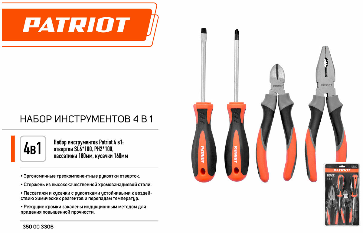 Универсальный набор инструментов PATRIOT SPS-4 / 4 в 1 / отвертки SL6х100, PH2х100 / пассатижи 180мм / кусачки 160мм / для дома и дачи