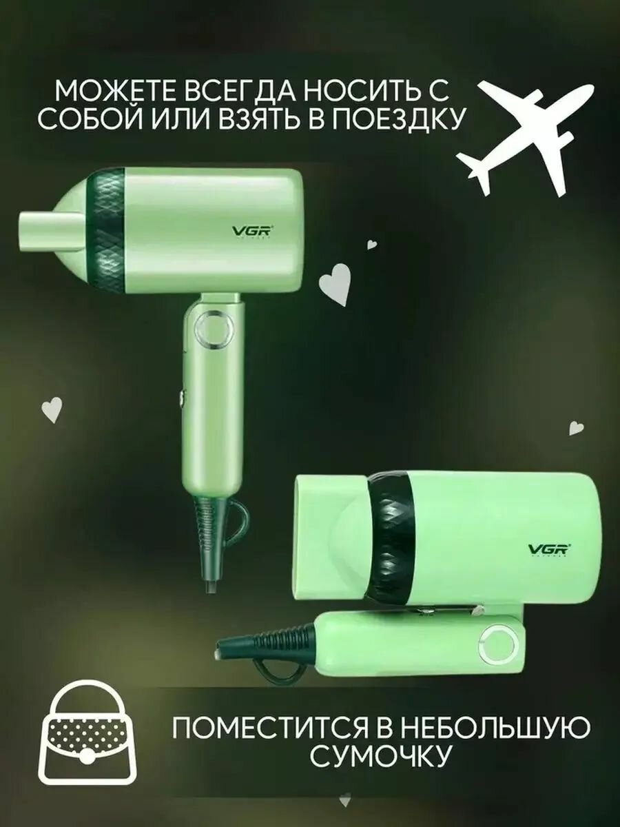 Фен для волос VGR V-432 с насадкой, складная ручка, компактный, дорожный