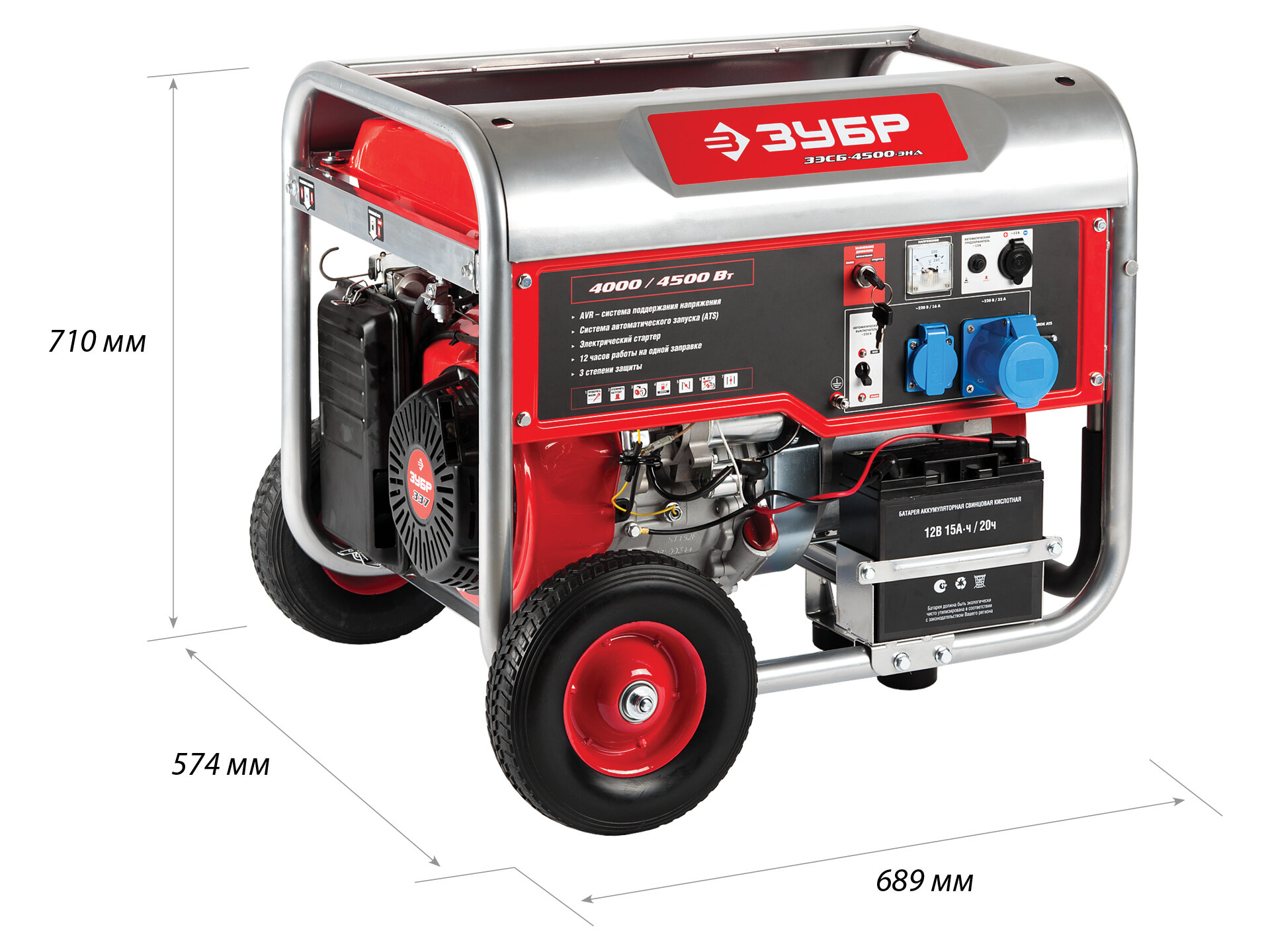 ЗУБР 4500 Вт, колеса и рукоятка, бензиновый генератор с автозапуском (ЗЭСБ-4500-ЭНА)