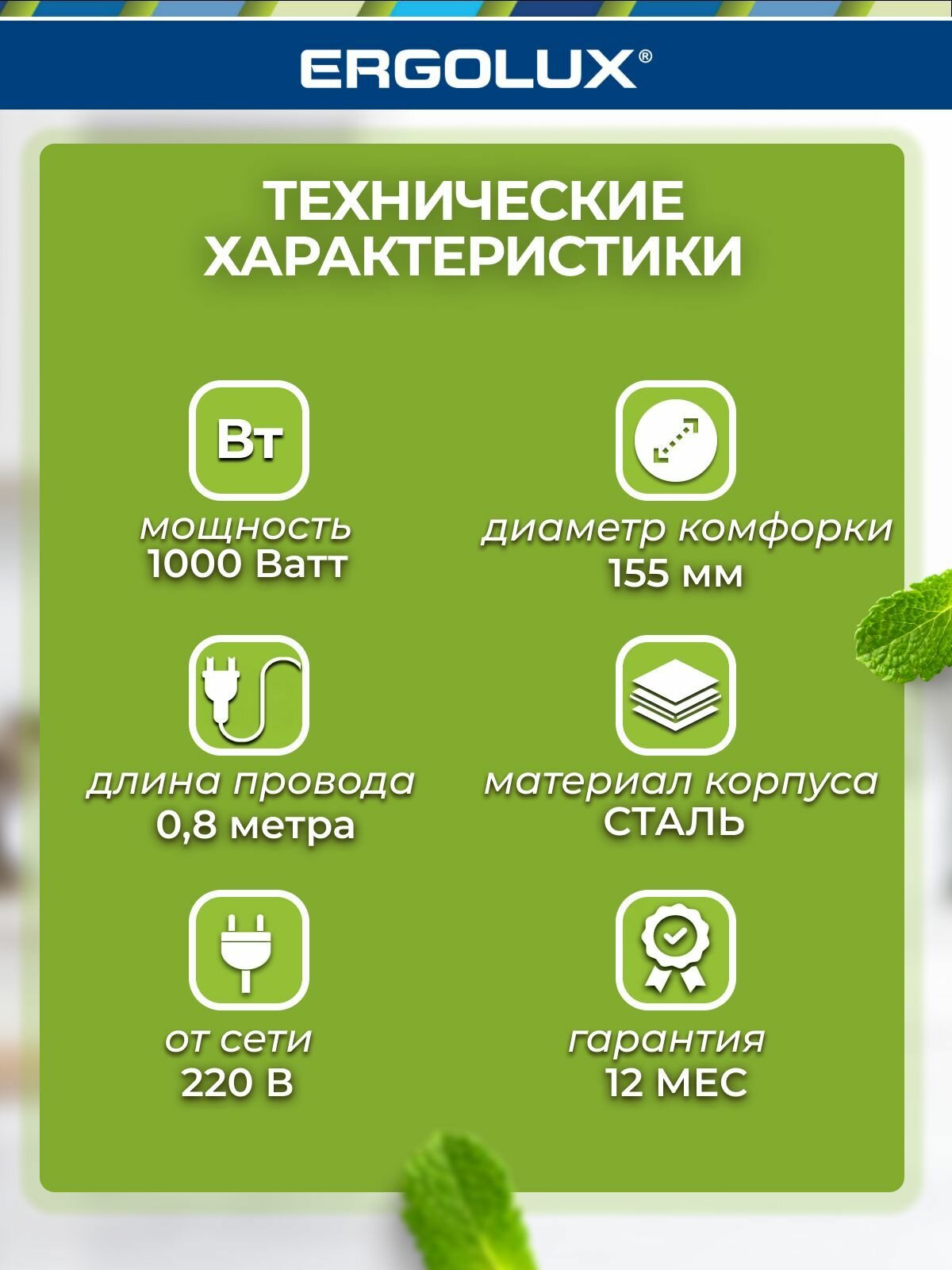 Электроплитка ELX-EP03-C01 белая (1 конф., дисковый нагр.эл.1000Вт, 220-240В) ERGOLUX