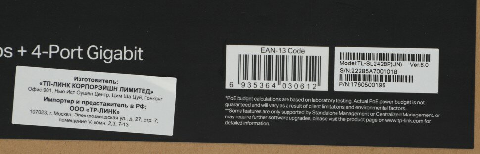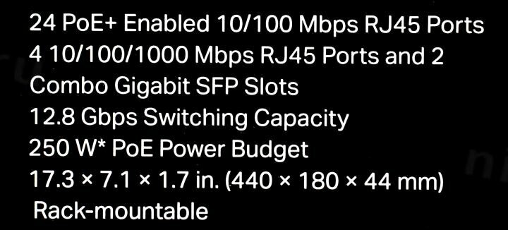 Коммутатор TP-LINK уровня 2 с 24 портами 10/100 Мбит/с, 4 гигабитными портами и 24 портами PoE+, черный