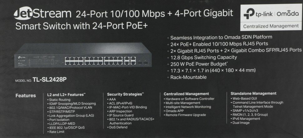 Ниже Вы можете прочитать отзывы на Коммутатор TP-Link SL2428P (L2) 24x100Мбит/с 4x1Гбит/с 2xКомбо(1000BASE-T/SFP) 24PoE+ 250W управляемый, ознакомится с подробными характеристиками, посмотреть интересные обзоры и фотографии на Коммутатор TP-Link SL2428P (L2) 24x100Мбит/с 4x1Гбит/с 2xКомбо(1000BASE-T/SFP) 24PoE+ 250W управляемый.