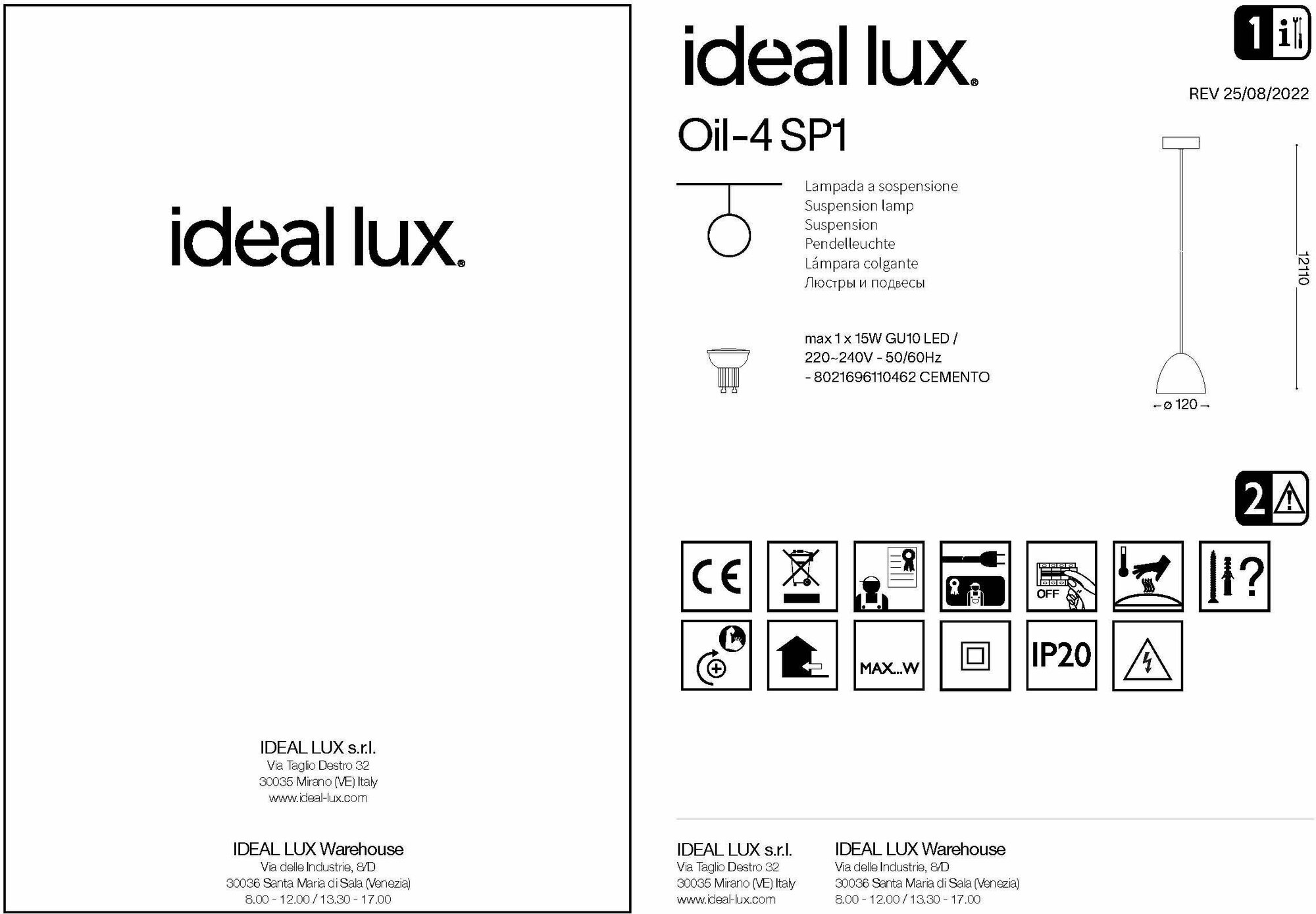 Светильник подвесной ideal lux Oil-2 SP1 макс.1x15Вт IP20 Е27 230В Серый/Черный Цемент/Металл Без лампы 110424.