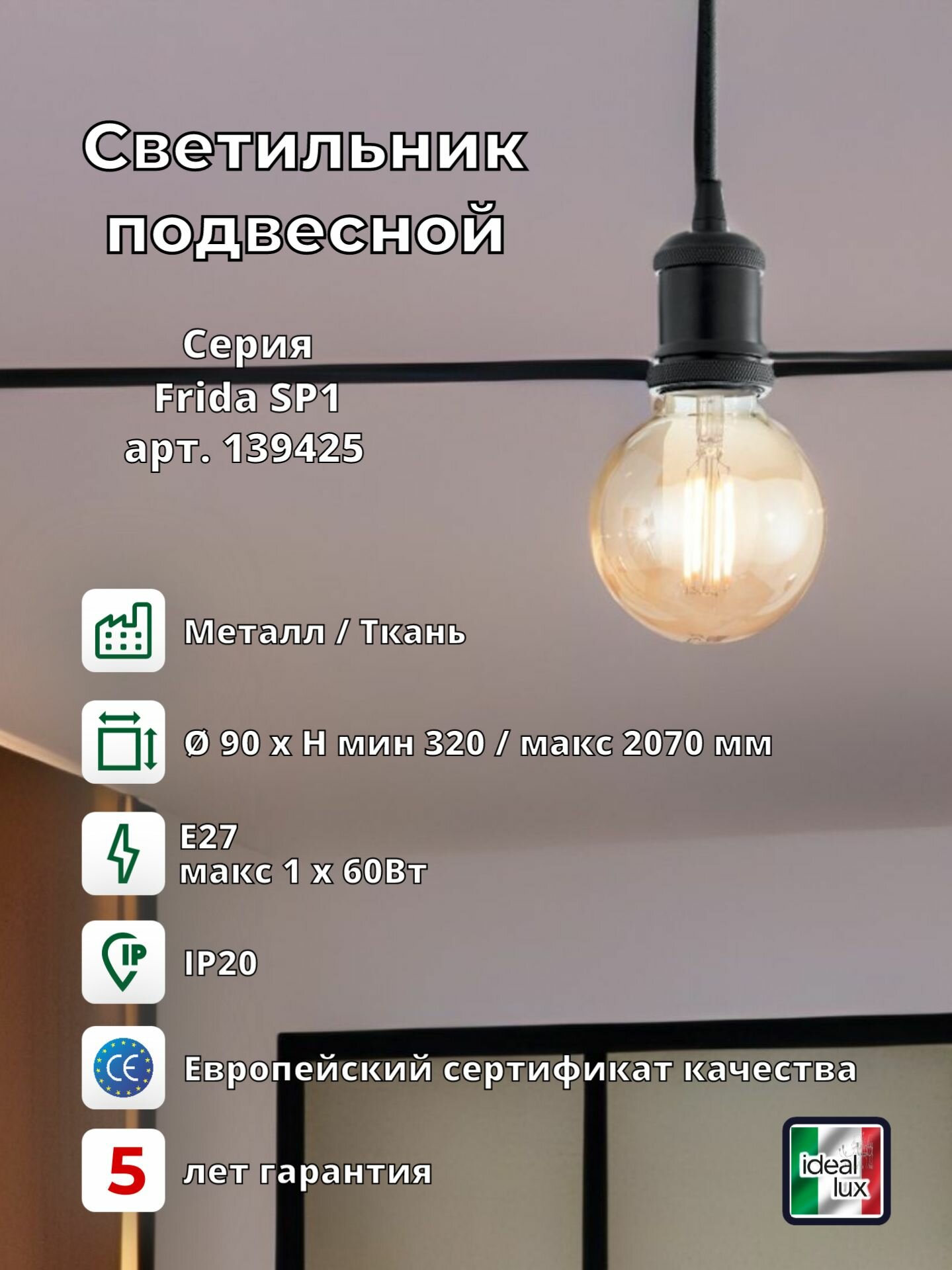 Купить Светильник подвесной ideal lux Frida SP1 макс.1х60Вт IP20 Е27 230В Черный Металл Без лампы 139425.